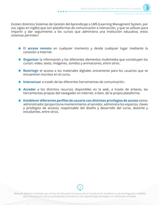 Este documento presenta una introducción a los Sistemas de Gestión del Aprendizaje (LMS), que son plataformas digitales utilizadas para impartir y dar seguimiento a cursos de forma remota. Explica que los LMS permiten organizar contenidos multimedia de un curso, restringir el acceso solo a estudiantes inscritos, facilitar la interacción entre usuarios, y establecer perfiles con diferentes niveles de acceso como administrador, diseñador, docente o estudiante.