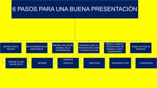 La guía ofrece 6 pasos para una buena presentación: 1) Empiece por el principio y domine el tema, 2) Sea informativo pero no abrume al público con detalles, 3) Prepare una visión general y organice gráficos para respaldar las ideas principales, 4) Practique como un actor para parecer seguro, 5) Hable con claridad y a un volumen comprensible, 6) Tenga un plan de respaldo si surge algún problema.