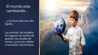El documento destaca cómo el mundo está en constante cambio, requiriendo la reinvención de normas y modelos de negocio. Presenta a Shakeup como una solución que genera valor y fomenta entornos de trabajo optimistas a través de tres pilares: modelo de negocio, mapa estratégico y personas. También enfatiza la importancia de comprender las necesidades de los clientes y generar equipos alineados y motivados.