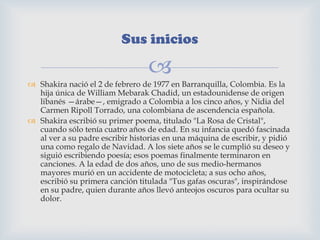 Shakira nació en 1977 en Barranquilla, Colombia. Comenzó a escribir poesía y canciones desde una edad temprana. Lanzó sus primeros álbumes en la década de 1990, pero tuvieron poco éxito comercial. Más tarde, alcanzó el reconocimiento internacional como una de las artistas latinas más exitosas de todos los tiempos, vendiendo más de 70 millones de discos en todo el mundo. También se destaca por su labor humanitaria a través de su fundación Pies Descalzos.