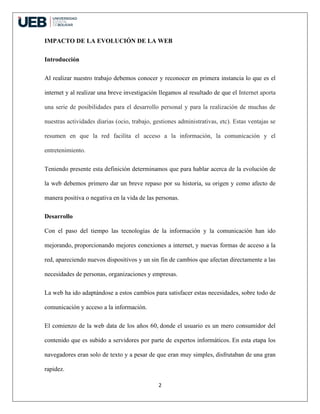 El documento analiza el impacto de la evolución de la web a través de los años. Explica que la web 1.0 permitía solo el acceso a la información, mientras que la web 2.0 permitió la colaboración entre usuarios y creación de contenido. La web 3.0 estructuró la información de forma semántica, y la web 4.0 introdujo la inteligencia artificial. Sin embargo, también señala que las redes sociales han afectado negativamente la conducta y privacidad de los usuarios, especialmente de los más jóvenes.