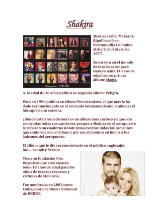Shakira Isabel Mebarak Ripoll nació en Barranquilla, Colombia en 1977. Comenzó su carrera musical a los 14 años y alcanzó reconocimiento internacional en 1996 con su álbum Pies Descalzos. Sus álbumes posteriores como ¿Dónde están los ladrones? y Laundry Service la llevaron a una audiencia más amplia en América Latina y el mundo anglosajón. Shakira también ha destacado por su trabajo filantrópico a través de su fundación Pies Descalzos.