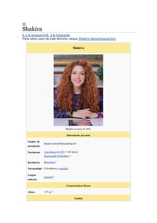 Shakira es una cantautora y bailarina colombiana que ha vendido más de 80 millones de discos, convirtiéndola en una de las artistas con mayores ventas en la historia. Comenzó su carrera musical en los años 90 y ha tenido éxito tanto en la música latina como anglosajona. Algunos de sus álbumes más exitosos son Pies Descalzos, ¿Dónde Están los Ladrones? y Laundry Service. También ha recibido numerosos premios como 3 Grammys y 12 Latin Grammys.