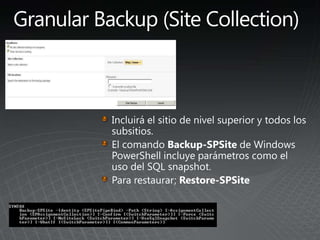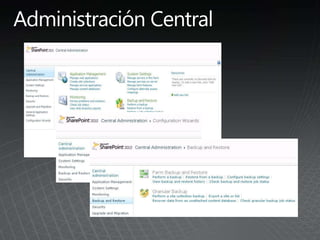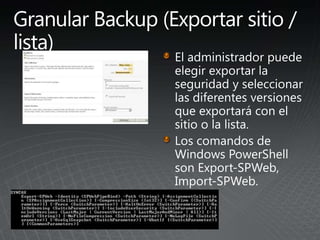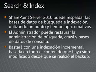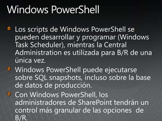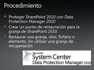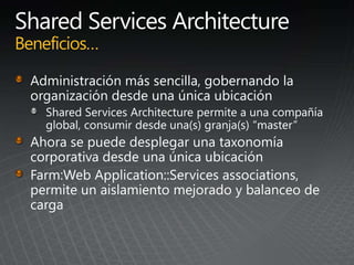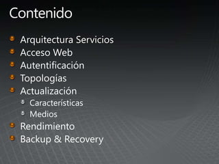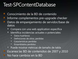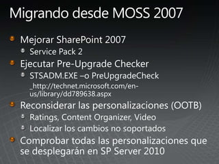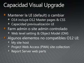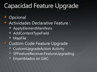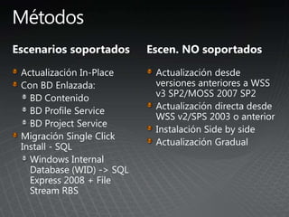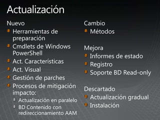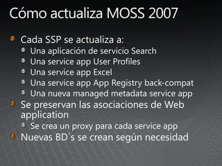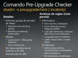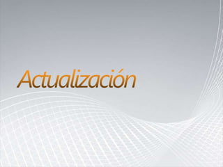 El documento describe los pasos para actualizar SharePoint, incluyendo aprender sobre los requisitos y métodos de actualización, preparar el entorno mediante la documentación y pruebas, implementar las actualizaciones de forma gradual entre granjas para minimizar las interrupciones, y validar que no haya problemas.