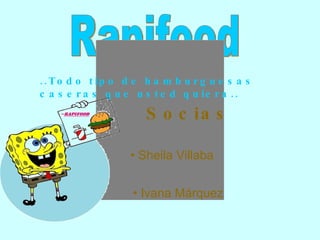 Rapifood es un negocio de hamburguesas caseras propuesto por Sheila Villaba e Ivana Márquez. El documento incluye un análisis de la competencia (McDonald's y Burger King), estrategias de venta y promoción, procesos de producción, lista de equipos e insumos necesarios, y una declaración de misión enfocada en ofrecer variedad de hamburguesas caseras a precios accesibles.