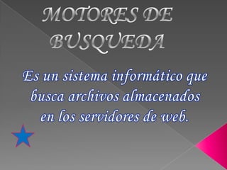 Este documento describe diferentes tipos de sistemas de búsqueda en Internet, incluyendo arañas que exploran la web, directorios que indexan sitios web sin almacenar contenido, sistemas mixtos que combinan características de arañas y directorios, metabuscadores que buscan en otros sitios, y buscadores de portal que solo buscan dentro de un sitio.