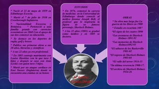 El documento analiza la obra literaria "La Liga de los Pelirrojos" de Arthur Conan Doyle. Presenta información biográfica sobre el autor y describe los personajes y escenarios clave de la historia. Finalmente, resume el argumento del cuento, en el que Sherlock Holmes descubre que el empleado del señor Wilson cavó un túnel para robar oro de un banco.