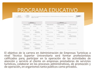 El documento describe un programa de Técnico Superior Universitario en Administración de Empresas Turísticas. El objetivo del programa es formar profesionales calificados para participar en operaciones de atención al cliente y procesos administrativos, de promoción y operación en empresas de servicios turísticos públicas y privadas. El egresado estará capacitado para colaborar en dichas empresas y entenderá la importancia del turismo para el desarrollo económico y social sustentable.