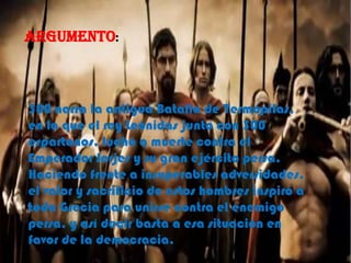 La película 300 narra la Batalla de las Termópilas entre 300 espartanos liderados por el rey Leónidas contra el enorme ejército persa del rey Jerjes. A pesar de su inferioridad numérica, los espartanos lucharon valientemente inspirando al resto de Grecia a unirse contra los persas en defensa de su democracia. La película detalla a los protagonistas y su lucha heroica a costa de sus propias vidas.