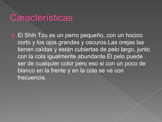 El documento describe la raza de perro Shih Tzu. Originario de China, el Shih Tzu es un perro pequeño con ojos grandes y oscuros, orejas y cola cubiertas de pelo largo. Su nombre significa "perro león" debido a su parecido con los leones. El Dalai Lama le obsequió ejemplares de la raza al Emperador chino en el siglo XVII, pero su popularidad disminuyó tras la muerte de la Emperatriz.
