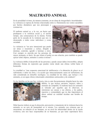 Este documento describe un trabajo académico sobre el maltrato animal realizado por un estudiante de la Universidad Técnica de Machala en Ecuador. Explica que el maltrato animal es un factor que predispone a la violencia social y puede ser un signo de abuso doméstico. También señala que la crueldad hacia los animales está relacionada con trastornos de conducta y que la educación sobre el respeto a los animales puede prevenir la violencia futura.