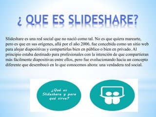 Slideshare comenzó en 2006 como un sitio para compartir presentaciones de diapositivas de manera pública o privada, pero evolucionó hacia una red social. Permite a los usuarios subir y compartir presentaciones de PowerPoint, PDF, documentos de Word y OpenOffice. Proporciona comentarios y evaluaciones de contenido. Es una herramienta educativa útil que permite a estudiantes y profesores interactuar y acceder a material didáctico de varios formatos.