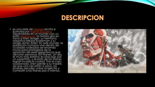 La serie de manga Attack on Titan, escrita e ilustrada por Hajime Isayama, se desarrolla en un mundo donde la humanidad vive dentro de ciudades amuralladas para protegerse de los titanes, seres gigantescos que devoran humanos. Un día, el muro más externo es destruido por un supertitán, permitiendo que los otros titanes invadan la ciudad. Tras la muerte de su madre, Eren Jaeger, Mikasa Ackerman y Armin Arlert deciden unirse al ejército para combatir a los titanes.