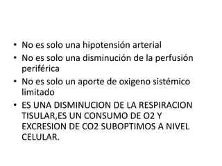 Este documento discute el manejo del shock. Explica que el shock no solo implica hipotensión arterial o disminución de la perfusión, sino una reducción de la respiración celular. Describe que el flujo sanguíneo se dirige primero a las arterias carótidas y coronarias, y luego se desvía de otros órganos. Finalmente, recomienda optimizar la volemia, usar fármacos inotrópicos como dobutamina y vasoconstrictores como norepinefrina para tratar el shock.