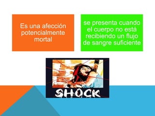 El documento proporciona información sobre diferentes tipos de shock. Resume los siguientes tipos principales de shock: shock cardíogeno (cuando el corazón está dañado y no puede bombear suficiente sangre), shock hipovolémico (causado por una pérdida significativa de sangre y líquidos), shock anafiláctico (una reacción alérgica grave al exponerse a un alérgeno) y shock séptico (una infección grave que causa baja presión arterial). Explica las causas, síntomas y tratamiento de cada