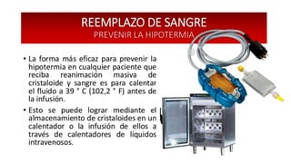 El documento habla sobre el shock, específicamente el shock hemorrágico. Explica la fisiopatología del shock y la pérdida de sangre, así como cómo reconocer el estado de shock y evaluar inicialmente a un paciente con shock. Describe el shock hemorrágico y no hemorrágico, y ofrece detalles sobre la clasificación, puntos clave, tratamiento inicial como reemplazo de sangre y consideraciones especiales para el shock hemorrágico. El documento enfatiza la importancia del trabajo en equipo para el tratamiento del shock