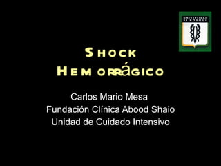 El documento describe el shock hemorrágico, incluyendo su definición como una condición en la que la perfusión tisular no puede sostener el metabolismo aeróbico, sus causas y manifestaciones fisiopatológicas, y los objetivos del tratamiento como mantener un gasto cardíaco y presión de perfusión adecuados.
