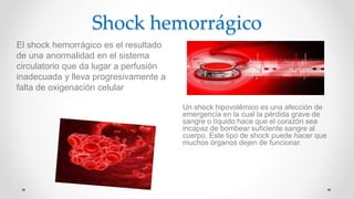 El documento trata sobre el shock hemorrágico. Este ocurre cuando se pierde una gran cantidad de sangre o líquidos, lo que impide que el corazón bombee suficiente sangre por el cuerpo. Esto puede dañar muchos órganos. El documento describe los signos y síntomas, causas comunes como traumatismos o cirugías, exámenes de diagnóstico y el tratamiento de emergencia e inmediato requerido.
