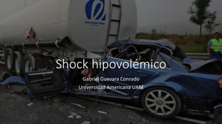 Este documento describe el shock hipovolémico, incluyendo su definición, fisiopatología, causas, etapas, evaluación de gravedad, tratamiento con líquidos y transfusión sanguínea, y posibles complicaciones del tratamiento. Explica que el shock hipovolémico ocurre cuando hay bajo flujo sanguíneo debido a pérdida de volumen, lo que puede llevar a disfunción orgánica si no se trata adecuadamente.