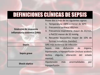 La sepsis y sus agravamientos como la sepsis grave y el shock séptico son la primera causa mundial de muerte en las unidades de cuidados intensivos no cardiológicas. La sepsis se define como infección más SIRS, la sepsis grave como sepsis más disfunción de órgano, y el shock séptico como hipotensión más anormalidades por hipoperfusión. El tratamiento incluye soporte vital, fluidoterapia, fármacos vasoactivos e inotrópicos, y antibióticos de manera paralela a la reanimación.