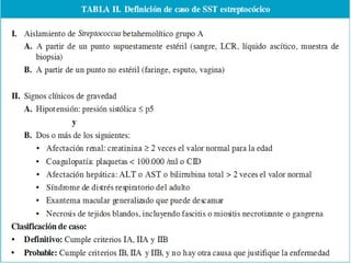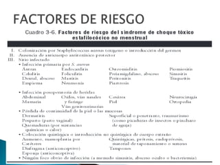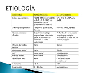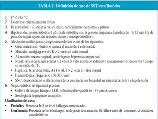 El síndrome de shock tóxico (SST) es una enfermedad sistémica aguda causada por la toxina TSST-1 producida principalmente por Staphylococcus aureus. Se caracteriza por fiebre alta, hipotensión, erupción cutánea y afectación de múltiples órganos. Aunque es raro, el SST tiene altas tasas de mortalidad si no se trata de manera rápida e inmediata con antibióticos y soporte de órganos.