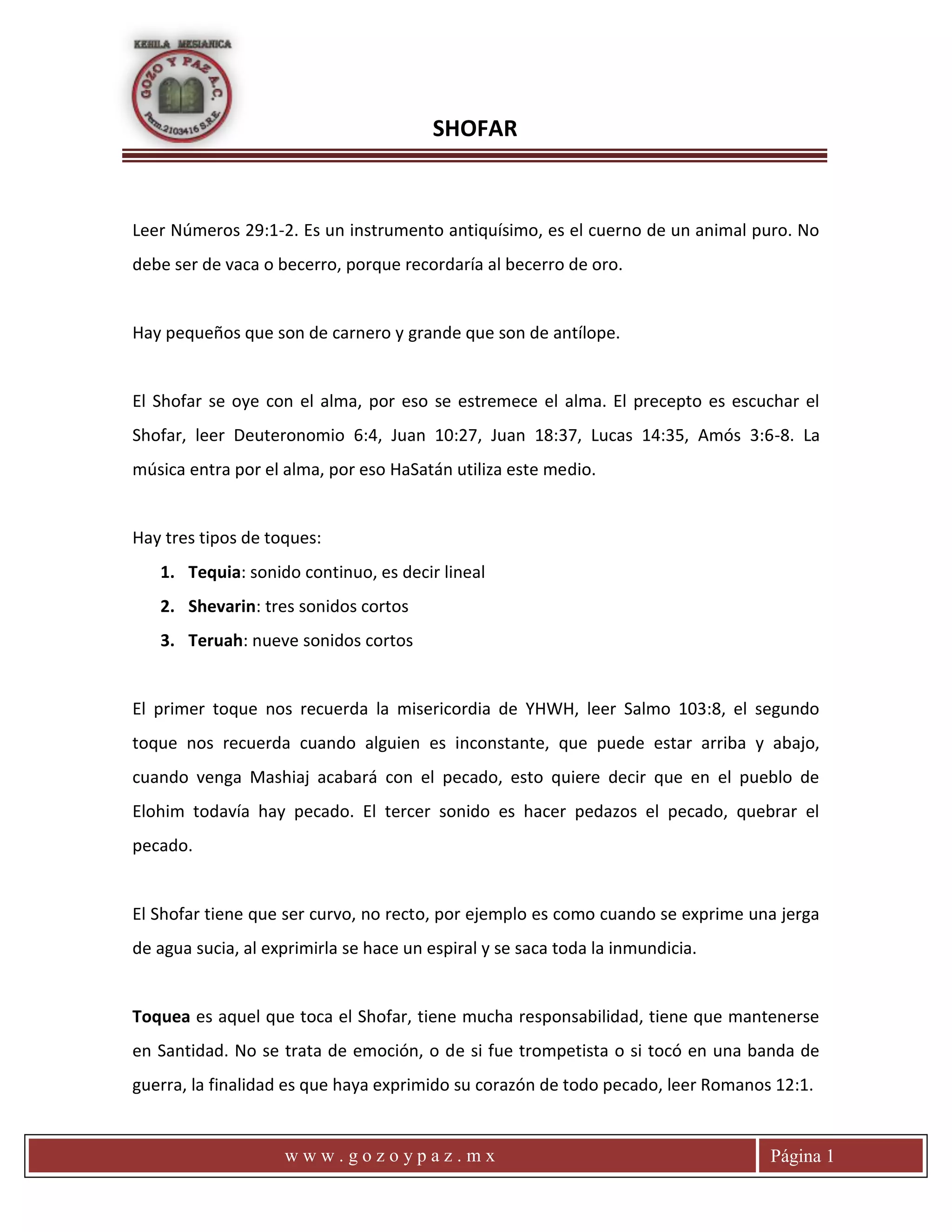 El shofar, un antiguo instrumento hecho de cuerno de animal puro, tiene un profundo simbolismo espiritual, resonando con el alma y recordando la misericordia divina. Se caracteriza por tres tipos de toques que representan conceptos como la inconstancia y la ruptura del pecado, y se utiliza en momentos significativos en la historia del pueblo de Israel, incluyendo Yom Kipur y eventos como la conquista de Jericó. La limpieza y purificación del shofar simbolizan el proceso espiritual de los creyentes, quienes deben ser restaurados y preparados por YHWH para cumplir sus propósitos.