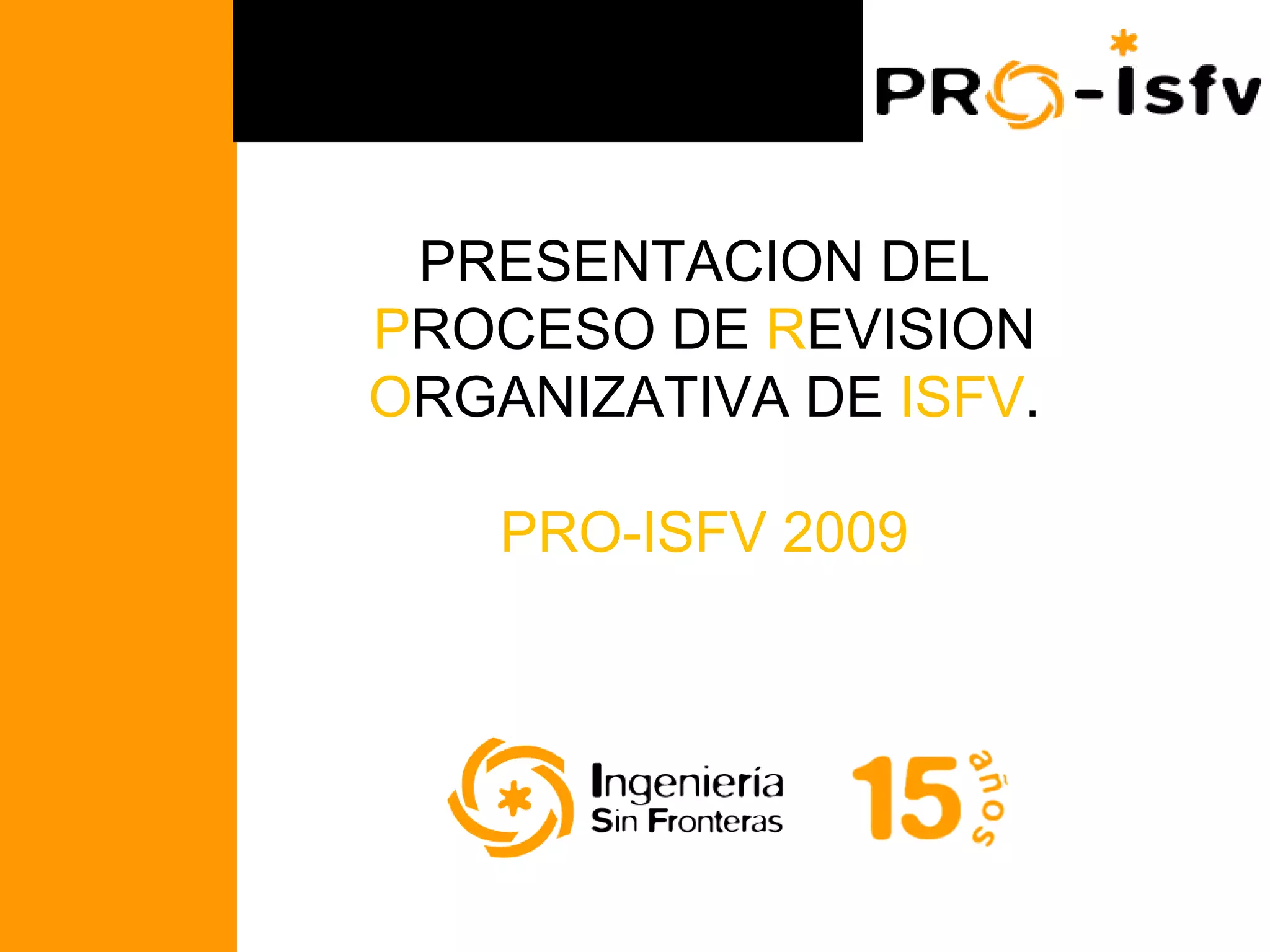 El documento presenta el Proceso de Revisión Organizativa de Ingeniería Sin Fronteras Valencia (PRO-ISFV), el cual consistió en dos ámbitos: la revisión organizacional y la revisión estratégica. El proceso se llevó a cabo mediante dinámicas participativas con voluntarios y tuvo cuatro fases, concluyendo con mejoras a la estructura organizativa, la comunicación interna, y la formación y acogida de nuevos voluntarios, así como una discusión sobre las prioridades y estrategia futura de la organiz