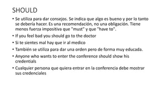 Should se utiliza para dar consejos o recomendaciones de forma educada, indicando que algo es bueno y se debería hacer, aunque no es una obligación. También puede usarse para dar órdenes de manera muy respetuosa. Follow se usa en pasado, presente y futuro para indicar lo que se debería haber hecho, lo que se debe hacer o lo que se deberá hacer, respectivamente, seguido del infinitivo del verbo principal sin "to". La forma negativa es shouldn't y la interrogativa es Should + sujeto.