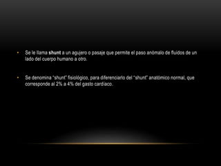 El documento describe el shunt pulmonar, que ocurre cuando la sangre pasa a través de alvéolos colapsados sin oxigenarse y se mezcla con la sangre arterial oxigenada, causando hipoxemia. Esto sucede comúnmente en edema pulmonar, neumonías y atelectasias. La gravedad de la hipoxemia depende del número de alvéolos afectados. Aunque el oxígeno suplementario no corrige la hipoxemia causada por el shunt, el uso de PEEP puede prevenir el colapso alveolar y