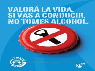 El documento advierte sobre los riesgos de conducir bajo los efectos del alcohol, indicando los límites legales de alcohol en la sangre y el aire expirado permitidos para conductores noveles, profesionales y en general. También enfatiza la responsabilidad individual de cada conductor de llegar a destino de forma segura y cuidar la vida propia y de los demás, exhortando a tomarse el manejo con calma.