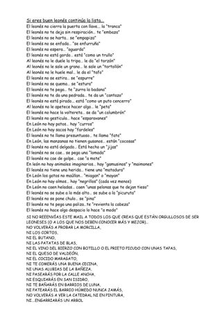 Este documento lista numerosas expresiones y palabras típicas de la región de León en España, que difieren de las expresiones estándares. Algunas de estas expresiones se refieren a cotillear (cuear), llover poco (pintear), empezar un jamón (encetar), hacerse daño (mancarse), pillar un dedo (trizarse un dedo), empujar (dar un emburrión), usar una bayeta (usar la rodilla, rodillo o rodea), llevar agua (llevar una herrada de agua), romper algo (mue