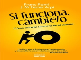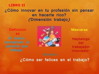 Este documento presenta varias ideas para innovar en el trabajo sin necesidad de enriquecerse. Propone que las personas pueden ser creativas e innovadoras si transforman su pensamiento creativo en acción y valor. También sugiere que para ser verdaderamente felices debemos trabajar en algo que nos haga felices. Finalmente, presenta varios modelos como Cirque du Soleil y El Padrino que lograron innovar estratégicamente.