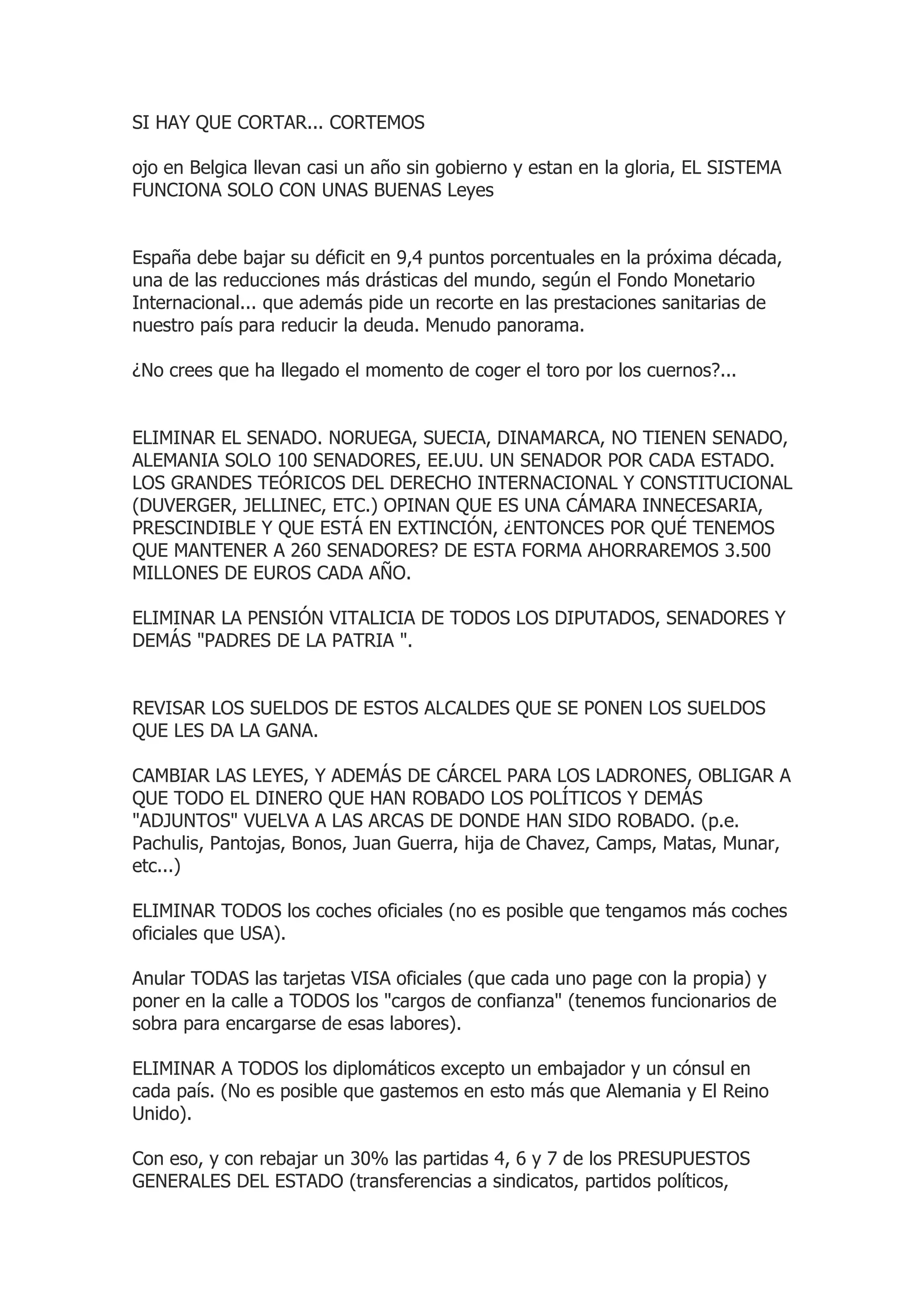 El documento propone una serie de medidas de austeridad para reducir el déficit de España, incluyendo la eliminación del Senado para ahorrar 3.500 millones de euros anuales, la eliminación de las pensiones vitalicias de políticos, y recortes del 30% en partidas presupuestarias como transferencias a sindicatos y partidos políticos para ahorrar más de 45.000 millones de euros. Argüye que con la mitad de los ahorros generados por estas medidas se podría acabar con la crisis en España.