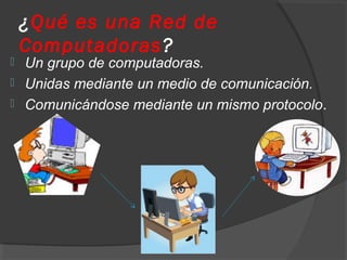 Una red de computadoras es un grupo de computadoras unidas mediante un medio de comunicación y que se comunican usando el mismo protocolo. Internet es un conjunto de estas redes interconectadas que permiten realizar actividades como videoconferencias, ver imágenes por satélite, observar por webcam, descargar películas o música y buscar información. Se necesita una computadora, tarjeta de red, modem, proveedor de internet y programa de conexión como un navegador para acceder a Internet.