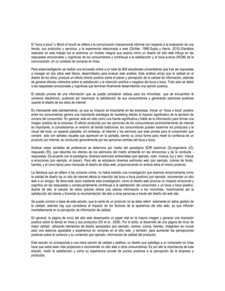 Este documento resume un estudio que examinó cómo la calidad del diseño de un sitio web afecta la satisfacción del cliente y la generación de "boca a boca" positivo. El estudio encontró que un diseño de alta calidad produce efectos positivos en las emociones y percepciones de los clientes, y contribuye indirectamente a una mayor satisfacción y probabilidad de que los clientes recomienden el sitio a otros. Esto sugiere que los minoristas deben enfocarse en el diseño de sus sitios web para maximizar la satisfacción de los client