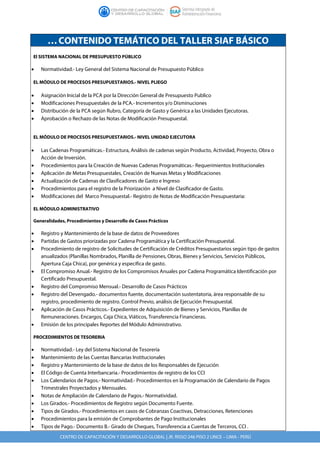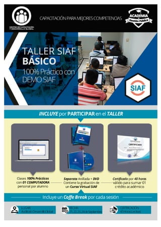 El documento describe el contenido de un taller sobre el Sistema Integrado de Administración Financiera (SIAF) Básico. El taller cubrirá el módulo de procesos presupuestarios a nivel de pliego y unidad ejecutora, el módulo administrativo, y los procedimientos de tesorería. Se detallan los temas como la asignación y modificación presupuestaria, las cadenas programáticas, el registro y seguimiento de compromisos y devengados, y los pagos y transferencias. El taller será dictado por