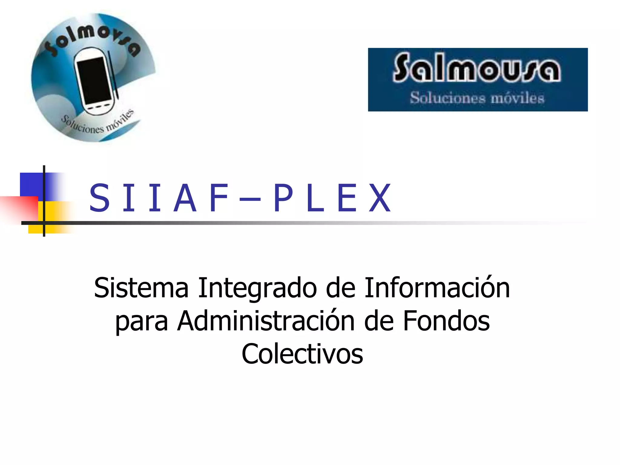 SIIAF-PLEX es un sistema integrado de información para la administración de fondos colectivos que automatiza los procesos e integra todos los elementos involucrados. El sistema permite la administración oportuna y detallada de la información de grupos, contratos, cobranzas y finanzas. SIIAF-PLEX tiene características como multi-compañía, multi-producto y multi-moneda, y su arquitectura es cliente-servidor y web. El sistema brinda ventajas como la integración de información, actualización en tiempo real, y es customizable