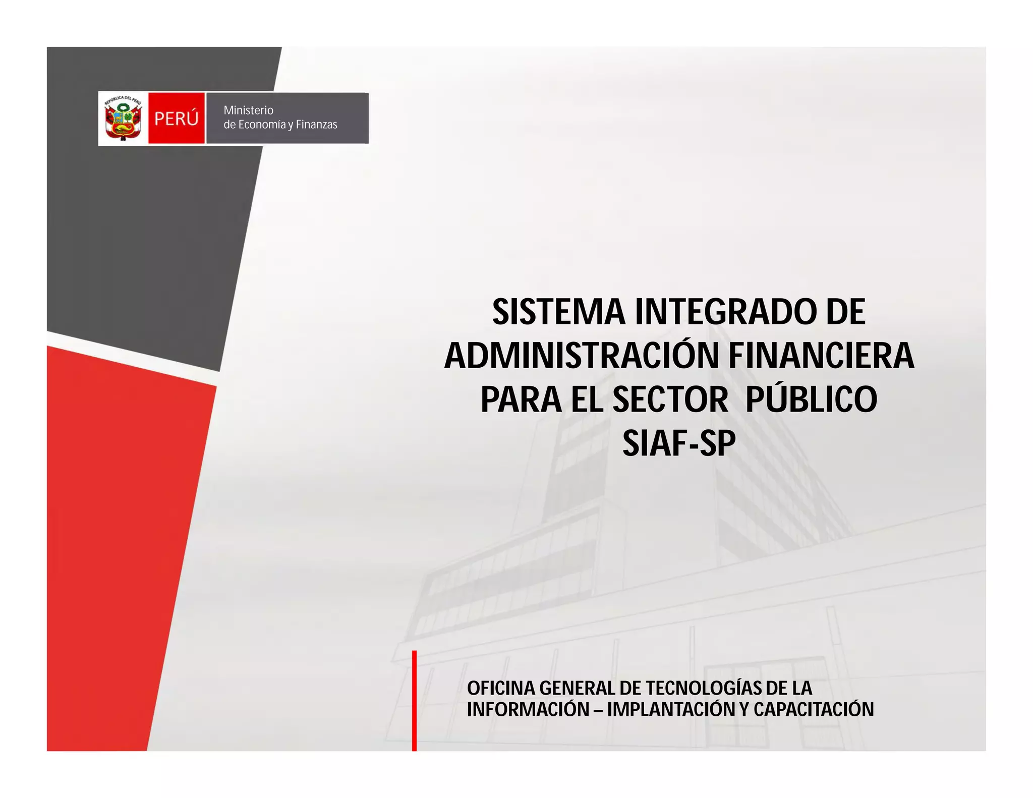 Este documento describe el Sistema Integrado de Administración Financiera para el Sector Público (SIAF-SP), el cual permite registrar, procesar y generar información relacionada con la administración financiera del sector público a nivel nacional, regional y local. El SIAF-SP está a cargo del Ministerio de Economía y Finanzas y consta de varios módulos como formulación presupuestal, procesos presupuestarios, administración financiera, contabilidad, control de pagos de planillas y deuda pública.