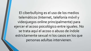 El ciberacoso, o ciberbullying, implica el acoso psicológico entre iguales a través de Internet, teléfonos móviles y videojuegos online. Se produce cuando un menor acosa, amenaza o humilla a otro mediante tecnología. Las formas de ciberbullying incluyen publicar fotos o datos personales de la víctima en sitios web para humillarla, crear perfiles falsos para difundir información embarazosa, y compartir imágenes comprometedoras sin consentimiento.