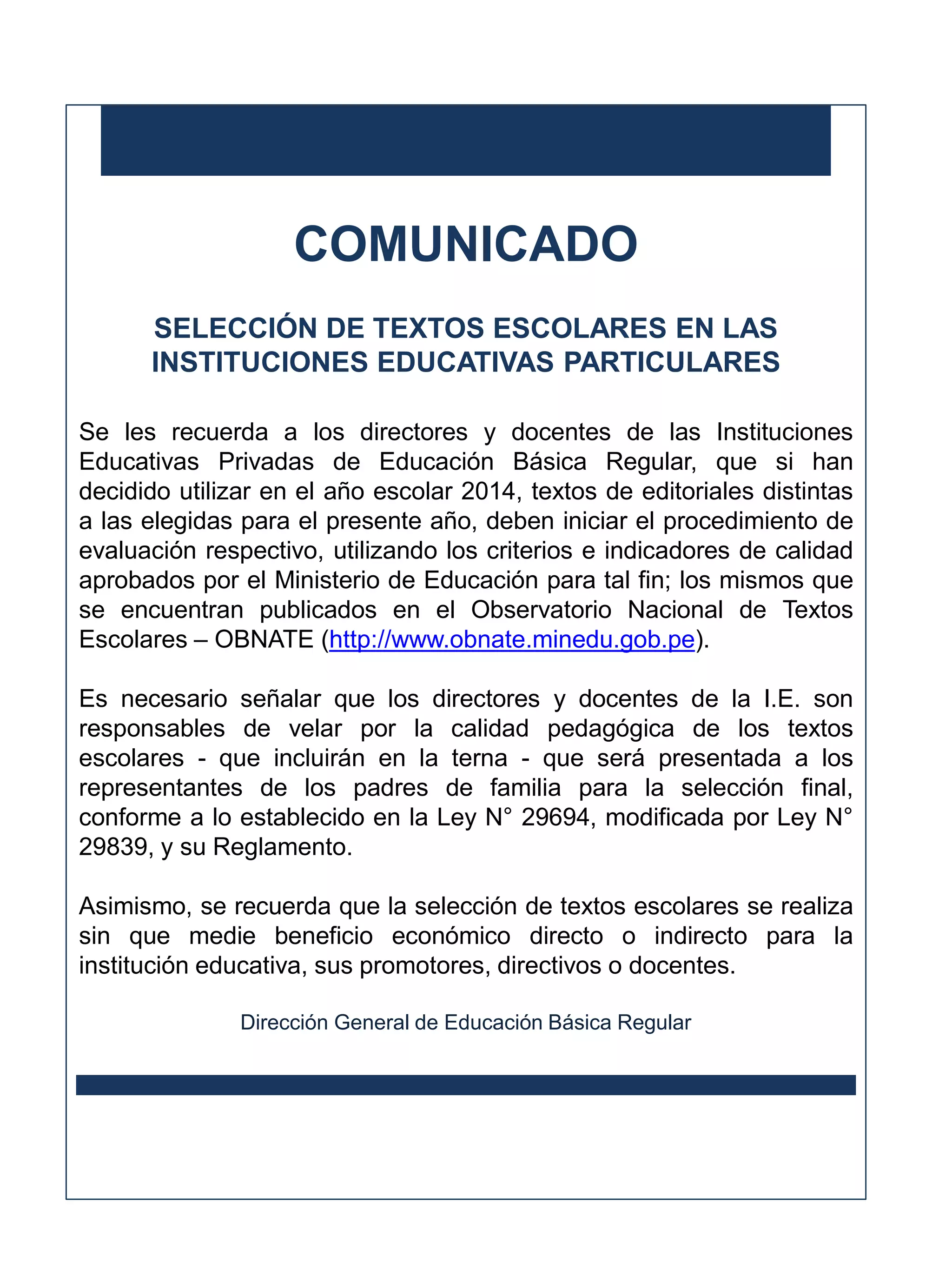 El comunicado recuerda a las instituciones educativas privadas que deben iniciar el procedimiento de evaluación y selección de textos escolares para el próximo año escolar utilizando los criterios e indicadores de calidad aprobados por el Ministerio de Educación, los directores y docentes son responsables de velar por la calidad pedagógica de los textos que presenten a los padres de familia para la selección final, y que la selección se debe realizar sin beneficio económico para la institución o sus trabajadores.