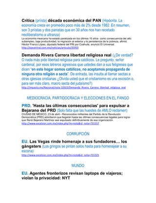 Este documento presenta una selección informativa de noticias de varias fuentes sobre temas como política, economía, sociedad y cultura de México y el mundo. Incluye artículos de opinión criticando al gobierno mexicano y al Vaticano.