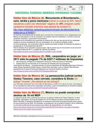 Este documento presenta varias noticias breves sobre temas relacionados con México. La primera noticia habla sobre el asesinato del hijo de un editor de un periódico en Sinaloa. Otra noticia indica que la tasa de desempleo en México aumentó en junio y afectó más a las mujeres. Otra más señala que las capturas de líderes de cárteles no han frenado el narcotráfico. Finalmente, la última noticia brinda detalles sobre el monumento conmemorativo del Bicentenario de la Independencia de