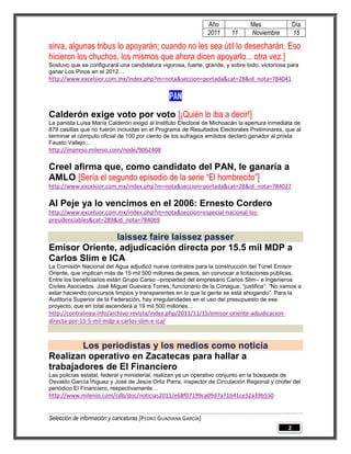 Este documento contiene varias noticias breves sobre temas políticos y de seguridad en México. Incluye encuestas que muestran a AMLO como favorito para las próximas elecciones presidenciales, reportes de violencia en el Estado de México y la Ciudad de México, y adjudicaciones de contratos a empresas de Carlos Slim sin licitación. También cubre protestas de maestros y padres de familia por inseguridad y una solicitud al IFE para revisar boletas electorales de 2006.
