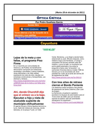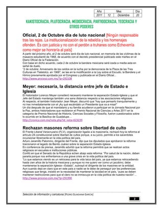 El documento presenta tres artículos relacionados con temas políticos y sociales en México. El primero habla sobre corrupción en el programa Piso Firme. El segundo menciona que se declarará el 2 de octubre como día de luto nacional por la masacre del 68. El tercero menciona que los masones rechazan una reforma sobre libertad de cultos.