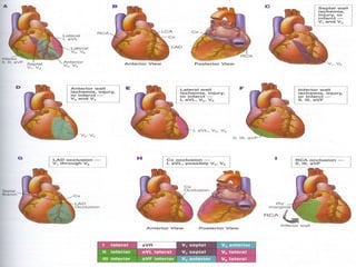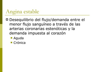 Este documento resume el síndrome isquémico coronario agudo, incluyendo la angina estable e inestable y el infarto agudo de miocardio. Describe los mecanismos, manifestaciones clínicas, diagnóstico diferencial y tratamiento inicial para estos pacientes, con énfasis en la evaluación del ECG, administración de oxígeno, nitroglicerina, aspirina y morfina. También cubre marcadores cardiacos, fibrinólisis, heparina y otras terapias.