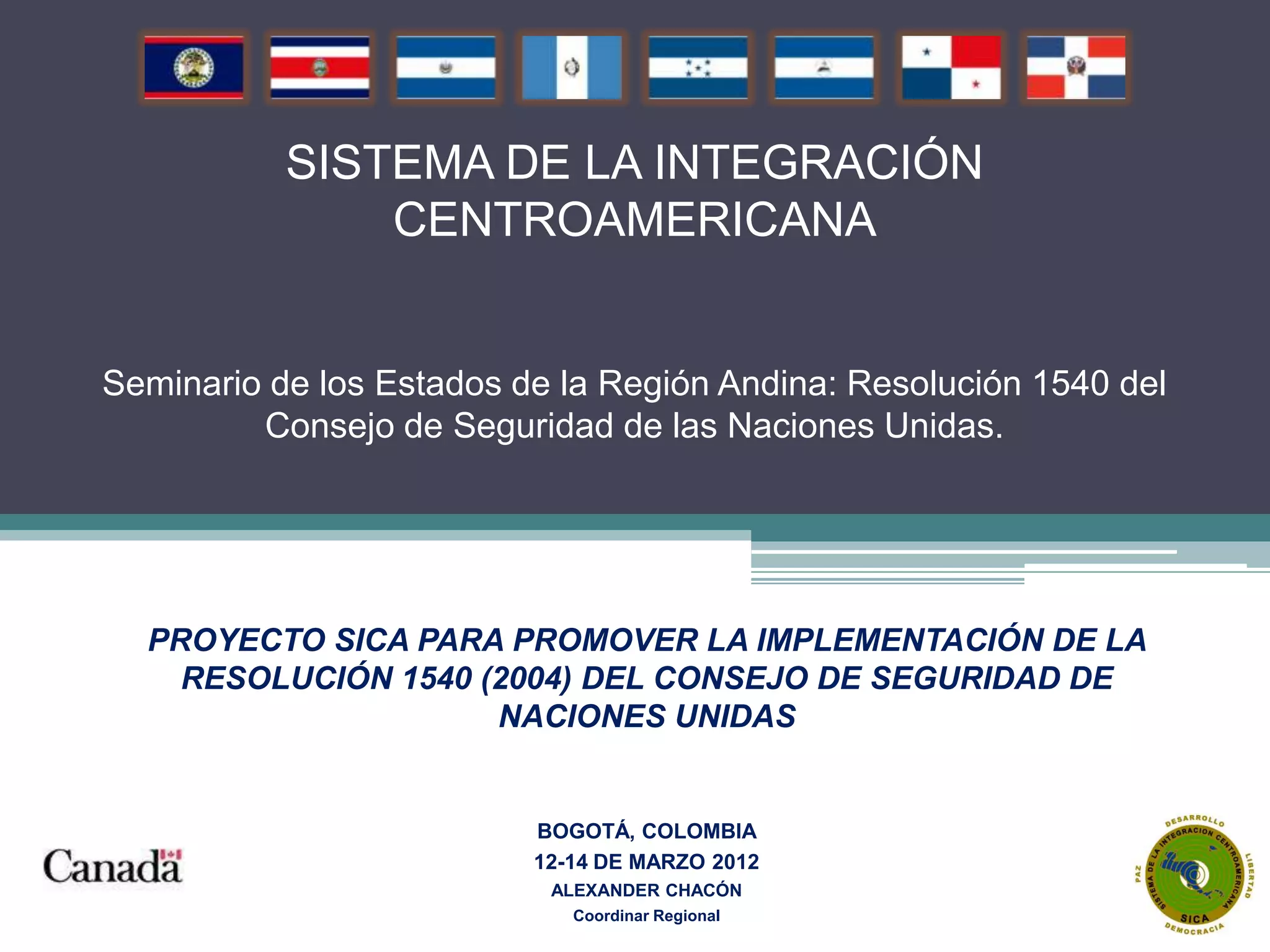 El documento describe un proyecto del Sistema de Integración Centroamericana (SICA) para promover la implementación de la Resolución 1540 (2004) del Consejo de Seguridad de la ONU entre los estados miembros. El proyecto busca establecer canales de comunicación con actores clave, identificar necesidades nacionales, y fomentar la armonización legislativa para cumplir con la resolución. El objetivo final es la conformación de comisiones interinstitucionales en cada país para coordinar esfuerzos regionales contra la