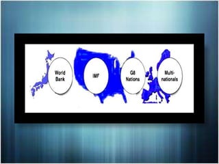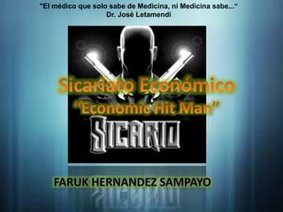Este documento describe la carrera de un economista estadounidense llamado John Perkins y su trabajo para una compañía llamada MAIN. Perkins fue entrenado para convencer a países en desarrollo de tomar grandes préstamos para proyectos de infraestructura que los dejarían en deuda por años, beneficiando a los intereses estadounidenses. Usó sus habilidades para endeudar a países como Indonesia, Panamá y Colombia.