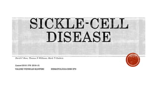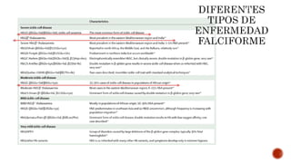 Este documento describe la anemia falciforme, el trastorno genético más común en el mundo. Se debe a una mutación en el gen de la beta-globina que causa la formación de hemoglobina S rígida. Esto conduce a la destrucción de los eritrocitos y oclusión vascular, causando síntomas como dolor, infecciones y daño orgánico. El tratamiento incluye hidroxiurea, transfusiones de sangre y quelación de hierro, aunque el trasplante de médula ósea es el único curativo. Se necesita