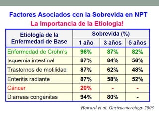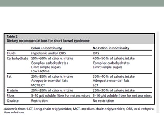 Este documento resume el síndrome de intestino corto, incluyendo su historia, conceptos, anatomía, etiología, fisiopatología, tratamiento médico y quirúrgico, y pronóstico. El síndrome se caracteriza por diarrea, malabsorción y desnutrición como resultado de una longitud inadecuada de intestino delgado. El tratamiento incluye dietas especiales, nutrición parenteral y quirúrgicas como alargamiento intestinal o trasplante en casos graves.