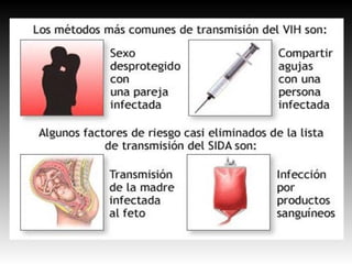 El documento habla sobre el SIDA. Explica que el SIDA es causado por el virus VIH que debilita el sistema inmunológico y lo hace susceptible a infecciones. Describe los síntomas como agotamiento, glándulas hinchadas, fiebre y pérdida de peso. También menciona que existen medicamentos antirretrovirales que reducen la replicación del VIH y el uso de preservativos para la prevención. Finalmente advierte que sin tratamiento, la persona puede desarrollar varias enfermedades graves e incluso la muerte.
